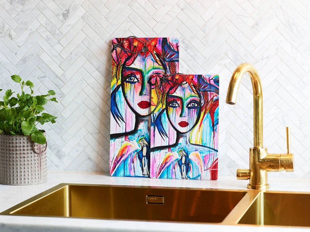 Schneidebrett aus Carolina Gynning. Ein buntes Schneidebrett mit dem beliebten „Slice of Life“ -Motiv. Es ist ein schönes Detail in der Küche auch wenn sie nicht verwendet wird. Ist aus Holz mit einer Schutz Melamin Oberfläche. Sollte nicht in der Spülmaschine gereinigt werden.